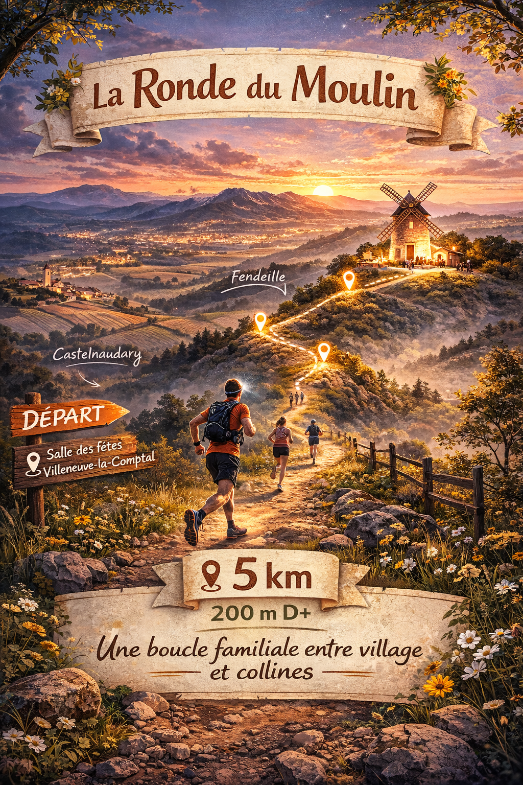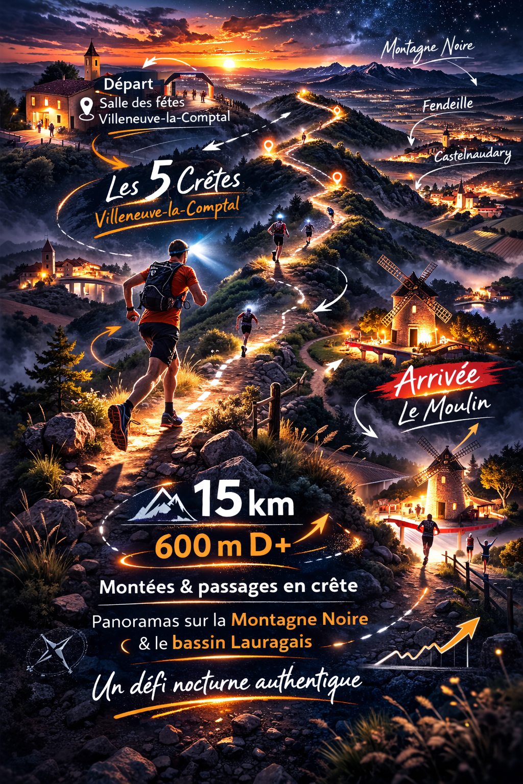 À la tombée du jour, le parcours 15 km du Souffle des Crêtes s’élance depuis la Salle des fêtes de Villeneuve-la-Comptal pour une immersion complète au cœur des paysages du Lauragais. Dès les premiers kilomètres, les sentiers quittent le village pour rejoindre les hauteurs et enchaîner progressivement les cinq crêtes de Villeneuve-la-Comptal. Ce tracé exigeant alterne montées, relances et passages en crête, offrant des panoramas remarquables sur Castelnaudary, Fendeille et l’ensemble du bassin lauragais. À la lueur des frontales, le relief se révèle différemment, le silence de la nuit, les lignes des crêtes de la montagne noire et les lumières lointaines de la pleine lauragaise renforcent l’intensité de l’effort et l’expérience du trail nocturne. Chaque sommet franchi récompense les coureurs par une sensation de progression et de dépassement de soi en milieu naturel. Le parcours se conclut par un retour vers le village, avec le moulin emblématique à l’arrivée, point final d’un parcours sportif et authentique. Avec ses 600 m de dénivelé positif, ce 15 km s’adresse aux coureurs en quête de défi, désireux de vivre une aventure nocturne complète, fidèle à l’esprit du Souffle des Crêtes.