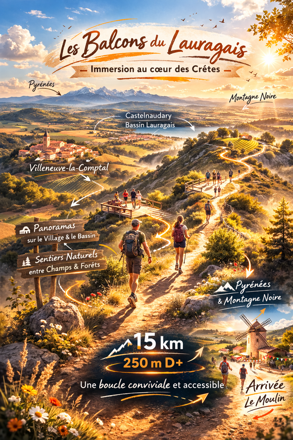 La randonnée propose une immersion douce et complète au cœur des paysages du Lauragais, en combinant les plus beaux passages des parcours 5 km et 15 km du Souffle des Crêtes. Au départ de Villeneuve-la-Comptal, l’itinéraire s’élève progressivement vers les hauteurs pour rejoindre les crêtes, offrant de larges panoramas sur le village, Castelnaudary et l’ensemble du bassin lauragais. Le cheminement alterne sentiers et chemins naturels, invitant à prendre le temps d’observer et de profiter pleinement du paysage. Tout au long du parcours, les points de vue se succèdent, avec en toile de fond les Pyrénées d’un côté et la Montagne Noire de l’autre, donnant à cette randonnée une dimension à la fois paisible et spectaculaire. Le retour vers le village s’effectue en douceur, avec le moulin emblématique à l’arrivée, point final d’une boucle conviviale et accessible à tous. Avec ses 250 mètres de dénivelé positif, "Les balcons du Lauragais" est idéale pour les marcheurs souhaitant découvrir les crêtes du Lauragais, partager un moment en pleine nature et vivre l’esprit du Souffle des Crêtes sans contrainte de chrono.