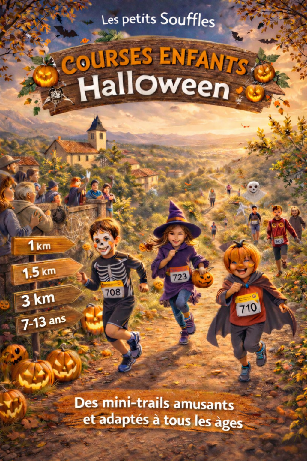 À l’occasion du Souffle des Crêtes, organisé le jour d’Halloween, les courses enfants prennent une dimension encore plus ludique et festive. Pensées comme une première aventure sportive, elles invitent les plus jeunes à découvrir le plaisir de courir… parfois même déguisés, s’ils le souhaitent ! Au cœur du village de Villeneuve-la-Comptal, les parcours serpentent dans les ruelles avant de rejoindre, pour les plus grands, une partie des premiers chemins empruntés par les autres courses, aux abords des collines. Les enfants alternent ainsi sections goudronnées et passages plus nature, dans un esprit de mini trail accessible et amusant. Chaque distance est adaptée à l’âge des participants. La plus courte (1 km) est un parcours entièrement sur route, au sein du village, idéal pour une première course (7 à 9 ans). Les deux autres (1,5 km et 3 km) sont des tracés plus typés mini-trail, mêlant chemins et relief doux, pour découvrir les sensations du trail (10 à 13 ans). Dans une ambiance conviviale et festive, encouragés par le public, les enfants vivent leur propre aventure sportive, à leur rythme, dans le respect des valeurs de notre trail.
